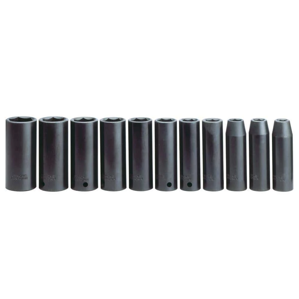 Powermate 1/2 in. drive impact socket set is perfect for the DIY or professional. Metric 12-pc socket set includes: 10 mm, 11 mm, 12 mm, 13 mm, 14 mm, 16 mm, 17 mm, 19 mm, 21 mm, 22 mm, 24 mm, and metal storage case. Sockets are both sturdy and durable, helping you with your toughtest jobs.