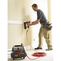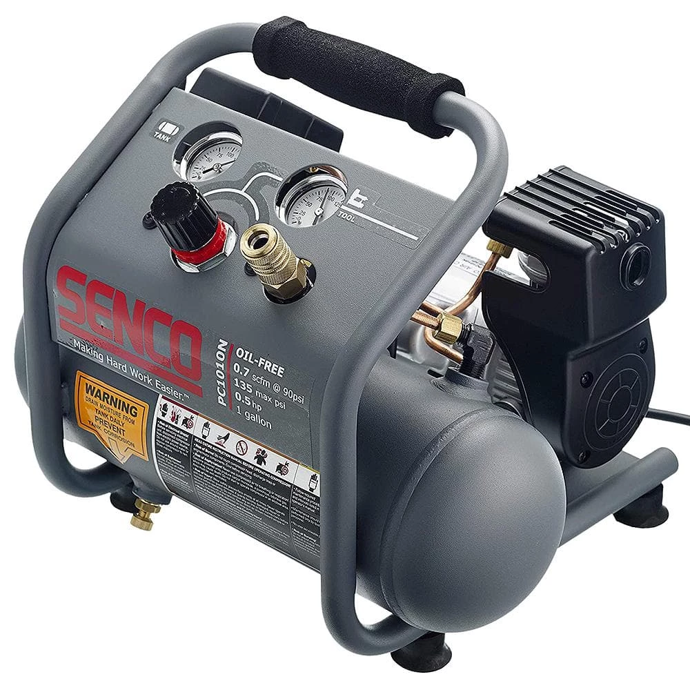 With a lightweight 20 lb. design that features a handle for convenient portability, the Senco 1 Gal. Portable Electric Air Compressor makes it easy to fill tires and other inflatables with air to keep them running smoothly using its powerful 1/2 HP, lube-less direct-drive motor. The aluminum cylinder provides durability for long-lasting use, while the tank pressure gauge lets you keep an eye on pressure levels.