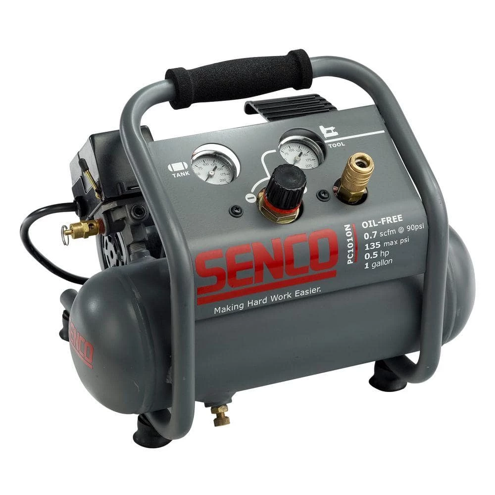 Senco’s 1 Gal. finish and trim air compressor is designed with the professional contractor in mind. The lightweight and compact design ensures easy portability combined with the ultra-quiet operation make this perfect finish and trim unit. The intuitive, rugged design features deliver the performance and function the pros demand. The long life induction motor and oil free pump design eliminate the need for oil or regular maintenance.
