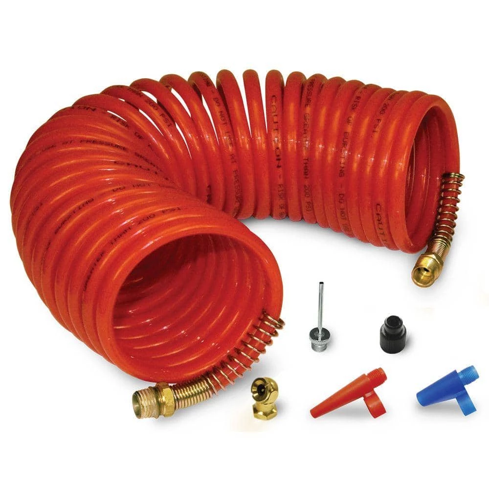 - Pieces include 25 ft. recoil air hose, inflation needle, 2 raft/mattress inflation nozzles, adapter fitting, ball tire chuck, quick coupler, and a male thread connector