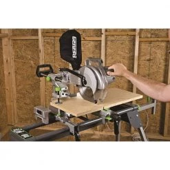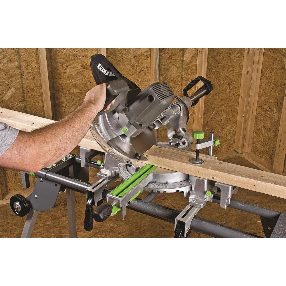 Genesis 15 Amp 10 in. Sliding Compound Miter Saw is a powerful, heavy duty machine with exceptional crosscutting capacity for all your repetitive wood cutting needs. Straight crosscuts up to 12 in., miter cuts, bevel cuts and compound cuts are a breeze, whether you are cutting flooring, siding, crown or base molding or you just need to cut dimensional lumber down to size. A heavy duty 15 Amp motor drives the blade at 4800 RPM for fast, smooth cutting. Updated saw has improved components, with increased stability in legs and tool platform, with easily adjustable knobs. A laser light cutting guide allows for quicker set up and improved accuracy. And your Genesis 10 in. sliding compound miter saw comes loaded, with a 60T carbide blade installed, hold down clamp, dust bag, 2 extension wings, rear support foot bar, blade wrench and 2 AAA batteries for the laser.