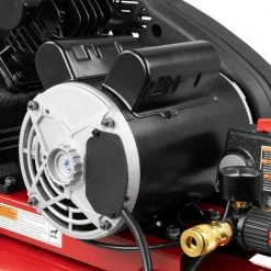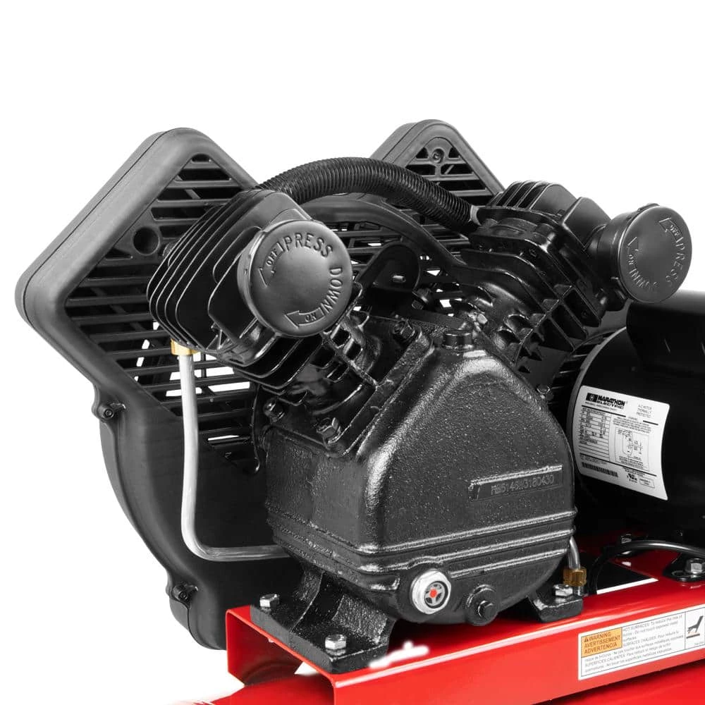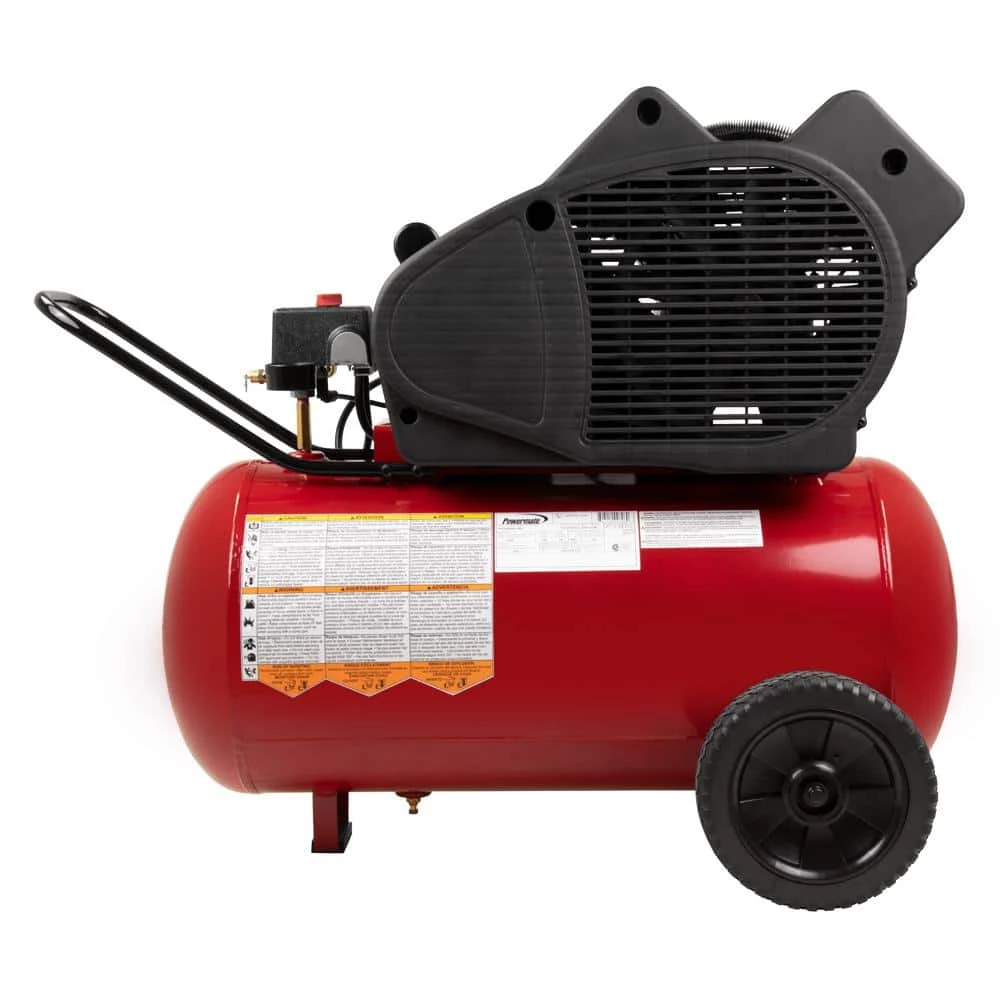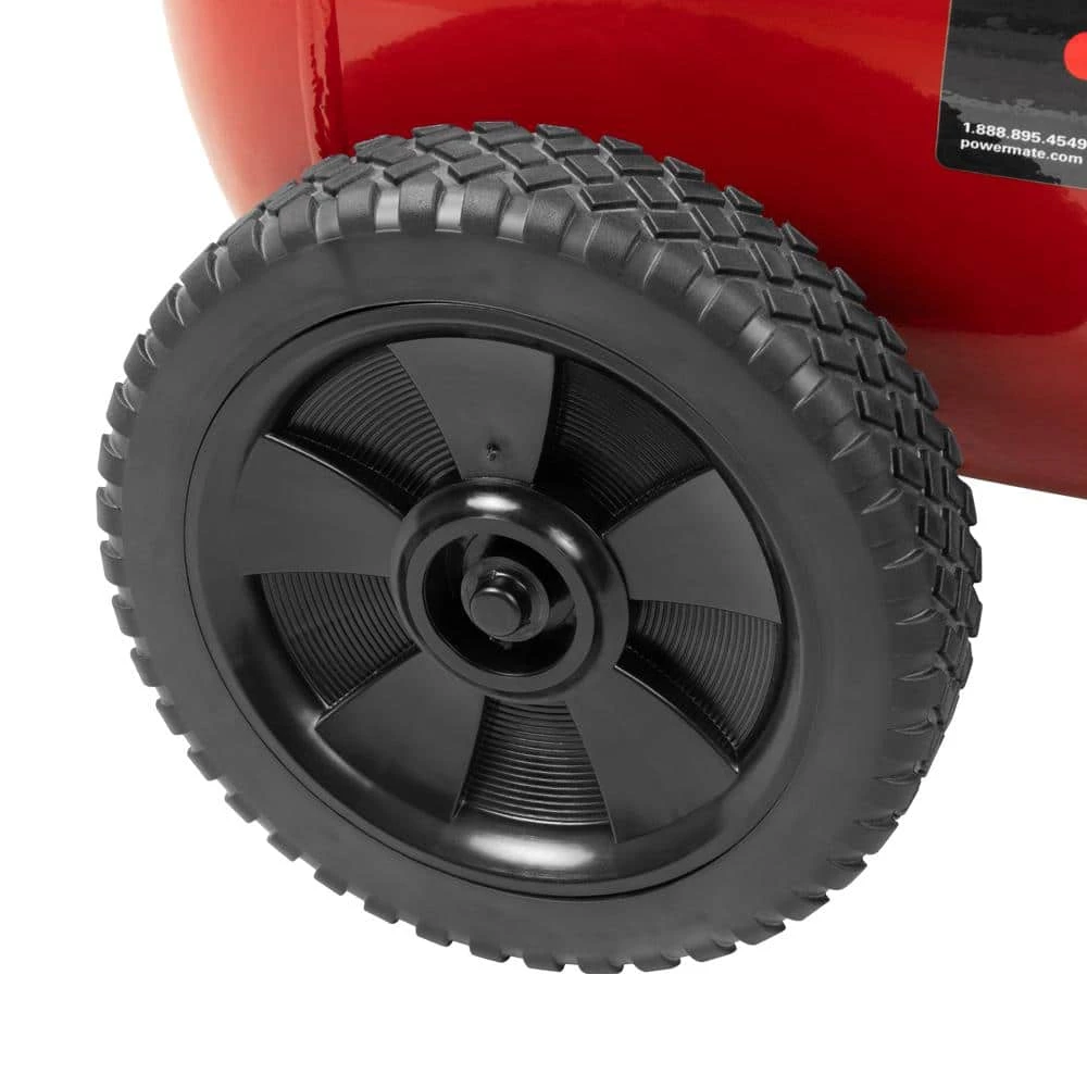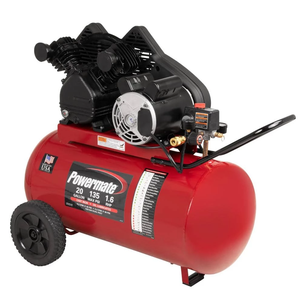 Powermate 20 Gal. compressor features a cast iron, v-twin cylinder, oil lubricated pump. Includes a 1-piece cast iron crankcase, thermally stable cast iron cylinder body, aluminum head and machined cast iron valve plate, automotive style ball bearings, durable stainless steel reed valves, oil level sight glass, easily accessible oil fill and a 10 cast iron balanced flywheel. CFM at 40 psi is 6.2 and CFM at 90 psi is 5.3.