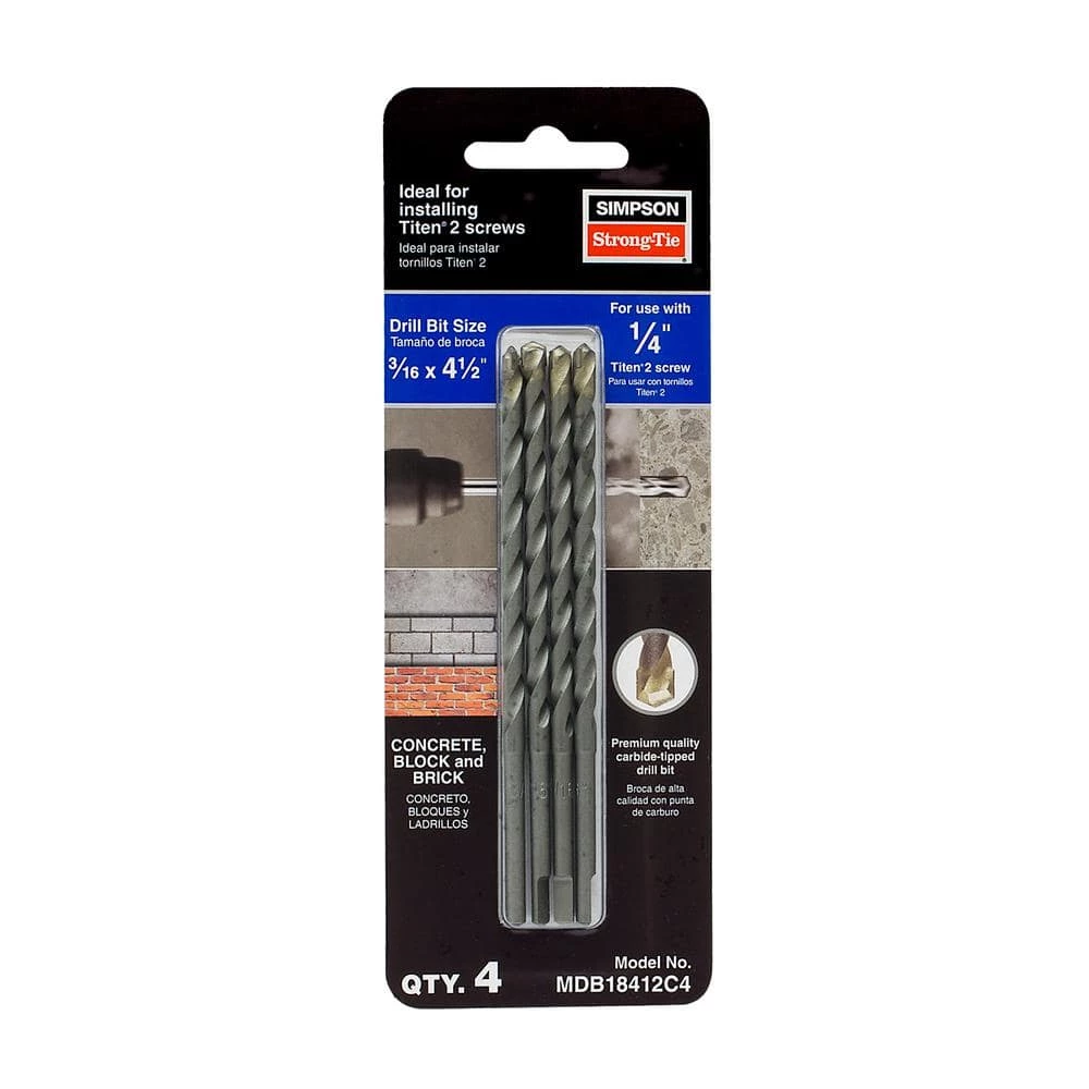 Titen screw drill bits enable predrilling and installation of concrete and masonry screws. The bits work with the Titen installation tool and also with drills with a standard, three-jaw-style chuck. These 3/16-in drill bits are available in 3-1/2-in, 4-1/2-in and 5-1/2-in lengths.