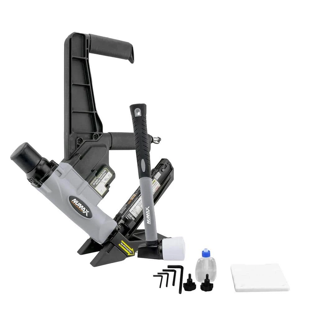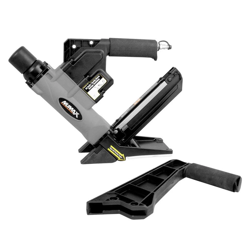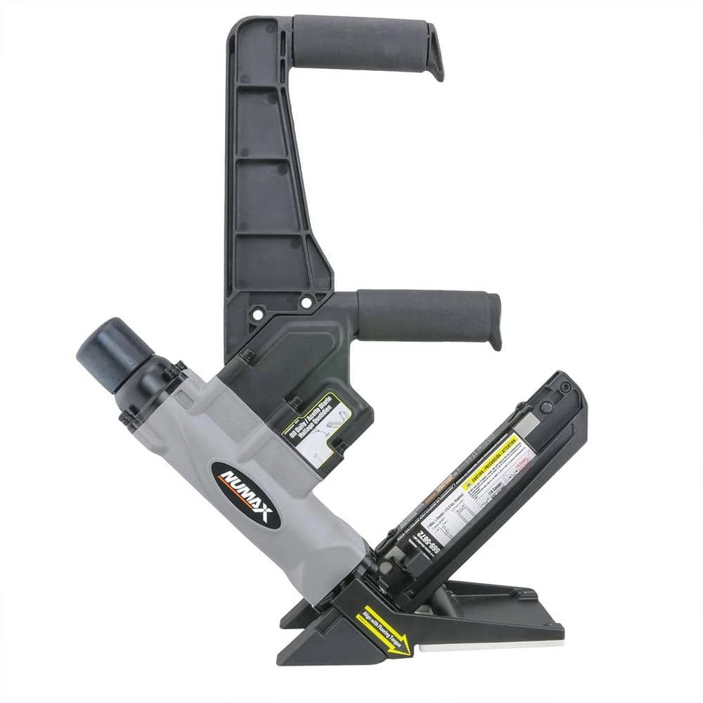 The NuMax S50LSDH Pneumatic 2-in-1 15.5-Gauge and 16-Gauge 2 in. Dual Handle Flooring Nailer and Stapler is an excellent choice when installing most 1/2 in. to 3/4 in. solid or engineered tongue and groove flooring including cherry, oak, maple, and walnut – along with bamboo or exotic flooring. This air powered flooring nailer and stapler combo tool comes with three interchangeable base plates, and is compatible with 16 gauge L-cleats and 15.5 gauge 1/2 in. crown staples from 1-1/2 in. to 2 in. for both types of fasteners. The dual handle design allows you to use either the short handle or extended handle, depending on whether you prefer to kneel or stand during installation. This option combined with a light strike bumper will save your back and reduce fatigue when working for long shifts. Professional results are ensured with a no mar foot to protect finished working surfaces. Boasting a lightweight and durable aluminum body, aluminum cylinder, and high quality rubber O-rings, this nailer is designed to last. This combo flooring nailer and stapler is perfect for DIYers tackling home improvement and repair projects, as well as construction contractors at the job site. The Pneumatic 2-in-1 15.5-Gauge and 16-Gauge 2 in. Dual Handle Flooring Nailer and Stapler includes a long reach fiberglass mallet with a padded grip, three interchangeable base plates, air tool oil, and adjustment tools, and is covered by NuMax’s 1 Year Limited Warranty and 30 Day Wearable Parts Warranty.