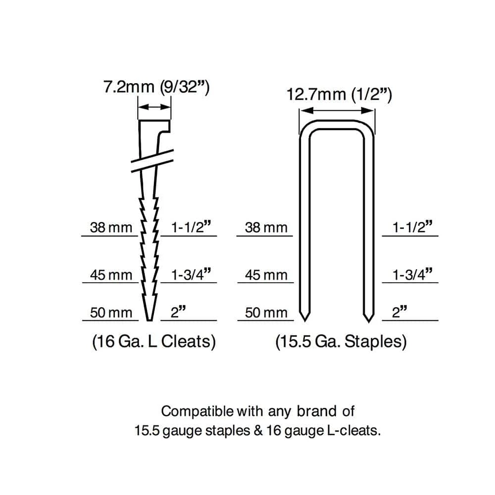 - Compatible with 16-Gauge glue collated L-cleats and 15.5-Gauge glue collated 1/2″ crown staples from 1-1/2″ to 2″ for both types of fasteners