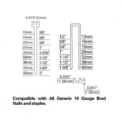 - Compatible with 18 gauge brad nails from 3/8 in. to 2 in., and 18 gauge 1/4 in. narrow crown staples from 1/2 in. to 1-5/8 in.