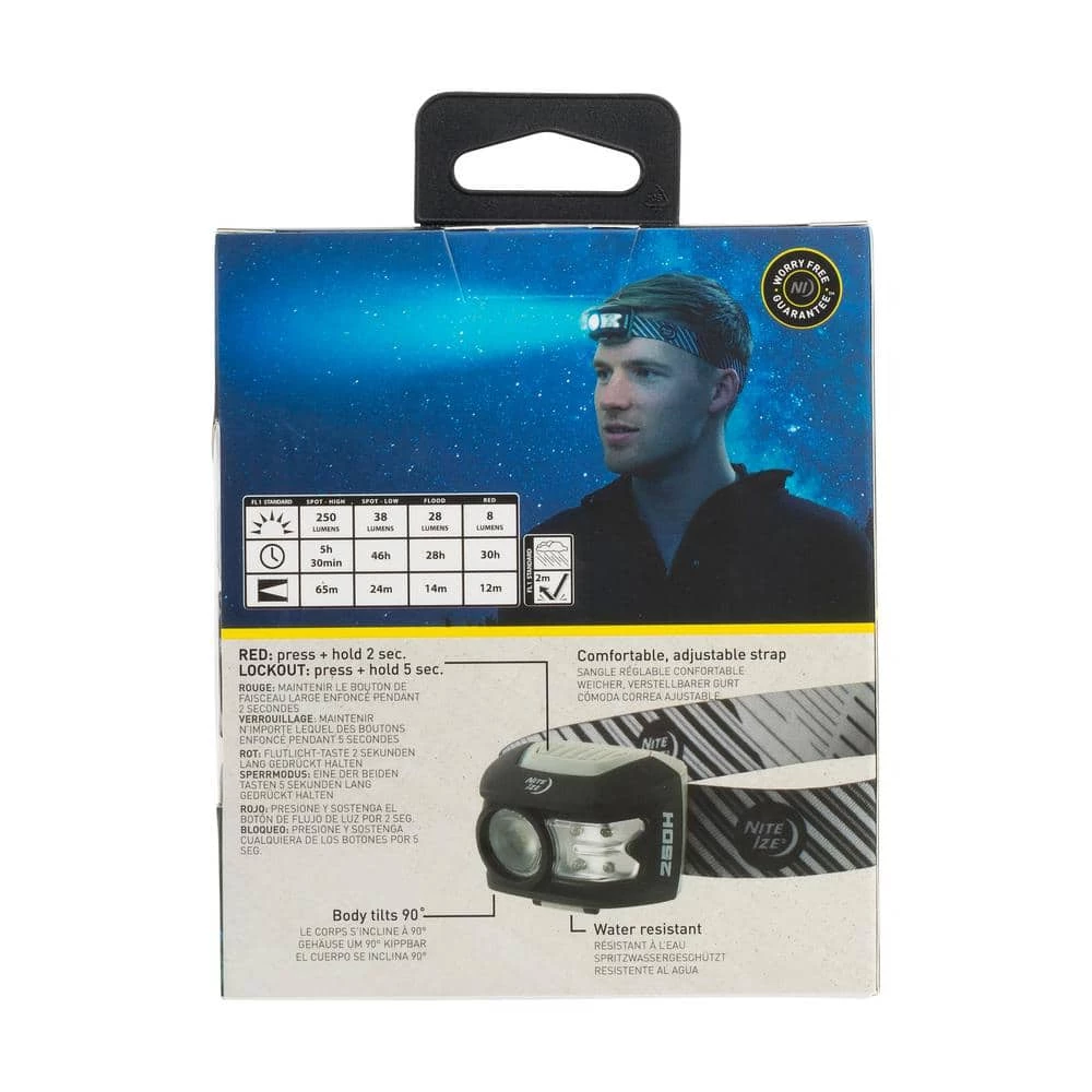 The Nite Ize Radiant 250 Headlamp brings together the functionality and brightness you want with the convenience of easily replaceable batteries. Featuring 250 Lumens of bright white light, this dual-color headlamp offers the ability to switch between white and red modes to preserve night vision. In addition to 4 LED modes, this headlamp offers lockout to prevent accidental activation and battery drain. This versatile hands-free lighting solution is impact and water resistant (IPX4) and features a body that can be tilted up to 90° for easy beam adjustment. Powered by 3 easily-replaceable AAA batteries (included), this headlamp offers a beam distance of 213 feet and can run for up to 46-hours.