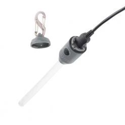 - Unscrew detachable top with included S-biner to access charging port