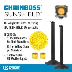 Built to withstand the demands of the toughest environments, the US Weight ChainBoss can be used both indoors and outdoors. The ChainBoss is equipped with features perfect for safely controlling crowds, directing the flow of foot traffic, or protecting a closed area for construction or cleaning. Each ChainBoss includes a yellow Solar Light that can be seen from 400m away and operates in temperatures minus 30° to 50°C. Each light flickers about 50 timers per minute and is designed for all-weather use. Optically controlled, these lights require no switch and are energy saving. The best way to charge these lights is to put them in direct sunlight. After fully charged outdoors, these lights can last approximately 7-days to 10-days. The ChainBoss features a patented Integrated Chain Storage system so chain is stored inside the post when not in use for incredible convenience. Then, easily pull the chain out of the post using the twist-lock top which allows for easy chain disbursement. Each 37.88 in. tall post includes 10 ft. of all-weather molded, high-tensile strength 2 in. plastic chain. Both the stanchion and the chain feature SunShield, 10 year UV protection. The ChainBoss features a durable, scratch-resistant high-density polyethylene 15 lbs. base. On the bottom of the base are no-skid, non-marking rubber feet keeping the post in place even during rough use. No tools are required for assembly.