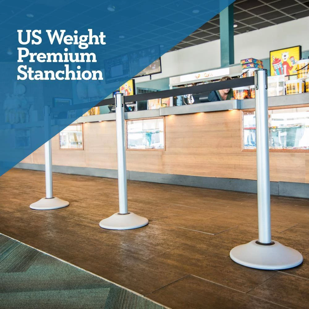 Safety comes first for US Weight and this priority is executed flawlessly with the Premium Steel Stanchion with an extended 13 ft. Pro Retractable Belt. This classic steel stanchion is perfect for safely controlling crowds, directing the flow of foot traffic or protecting a closed area for construction or cleaning. The 38.5 in. tall steel post features a Sherwin Williams Pro coat finish. Unlike other stanchions that begin to wobble over time and require endless repair, the US Weight Premium Stanchion will never lean or require maintenance due to our patented Sta-Straight Technology. Designed with 4 points of contact under continuous tension plus a high-strength compression collar, this spring-tension system keeps the post upright even after extended use. This stanchion also features innovative QuikSecure 5-second setup and tear down that requires no tools for easy twist-and-lock assembly. The post also features 3 belt receptacles to facilitate a 4-way connection to other posts. The belt end is compatible with most major stanchion brands allowing you to connect to the posts you already have. The base of the Premium Stanchion is made with durable, scratch-resistant high density polyethylene and filled with Duracast, a very high strength concrete. On the bottom of the base are no-skid, non-marking rubber feet keeping the post in place. To advertise signage, the Premium Stanchion is only compatible with #2507 Sign Holder (sold separately).